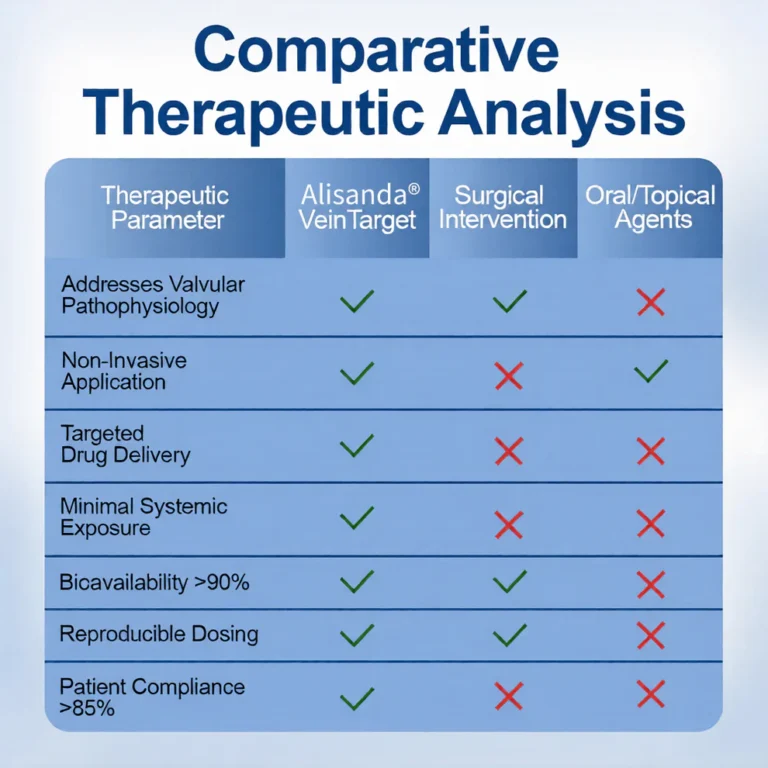 Alisanda® VeinTarget represents the first commercially available transdermal phytotherapy system specifically designed to address venous valvular insufficiency through localized botanical intervention. Unlike systemic treatments that dilute active compounds throughout the circulatory system or topical applications that cannot penetrate the dermal barrier,our microneedle delivery system ensures concentrated therapeutic compounds reach the target tissue with minimal systemic exposure.